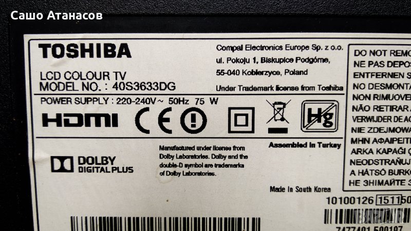 TOSHIBA 40S3633DG със счупена матрица (панел VES400UNDS-2D-N04 )