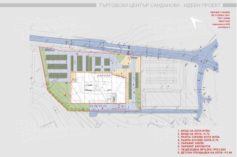 Представяме ви изключително атрактивен парцел с проект за търговски център в гр. Сандански. Имотът граничи с Главен път София Кулата и се намира в близост до новоизградената автомагистрала Струма, разположен на 2 км от центъра на града, срещу бул. Свобода, който e входната артерия на града. В непосредствена близост се намират обекти на големи търговски вериги Кауфланд, Техномаркет, бензиностанции ОМВ, Лукойл, винарни, хотели.