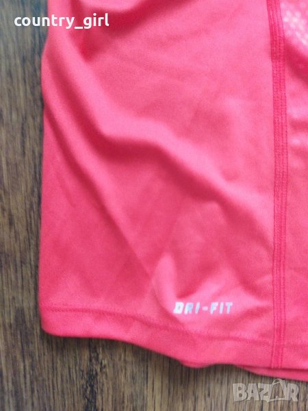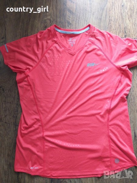 Nike - страхотна дамска тениска 100% оригинал тениската е като нова има забележка изгорено показано на последната снимка затова е такава цената точни размери дължина - 66см. ширина под мишници - 50см.