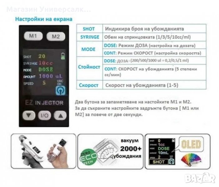 Регулируема дълбочина на инжектиране - доза, скорост и сила на засмукване.