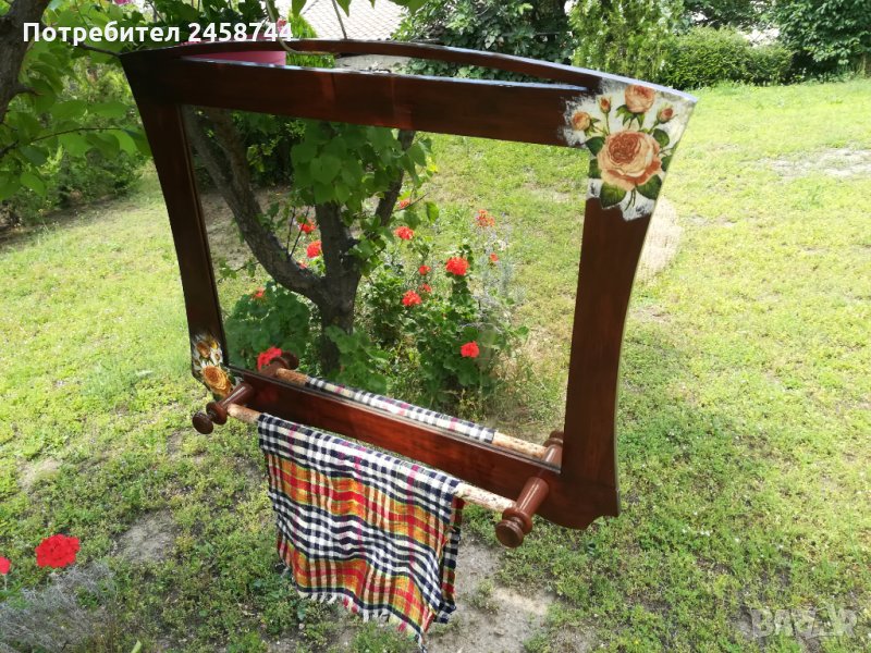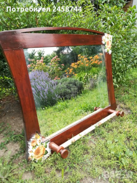 Много старо огледало, подновено с техниката декупаж. Има място за кърпа. Тя е подарък. Размери 80/64 см.