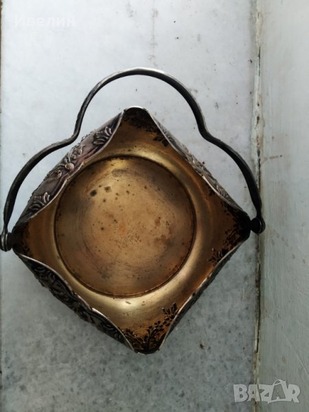 посребрена метална купа арт деко.висока е 5см.страните са 11см/11см,с вдигната дръжка е висока 16см.налична маркировка.