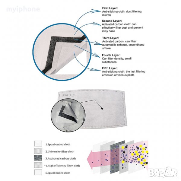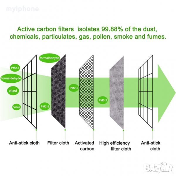 Технология на филтриране: Изработена от активен въглен и нетъкан филтър, разпенен с филтър, петслойна филтрираща система ефективно се пази от PM 2,5 и редица замърсители във въздуха;