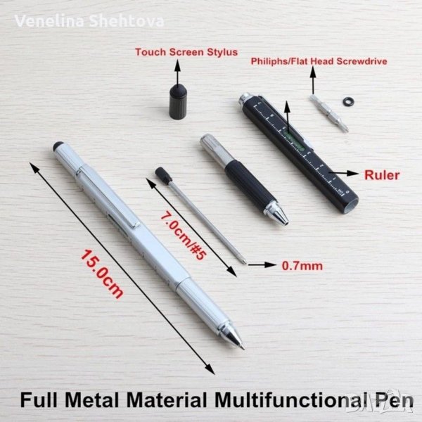 Този химикал притежава няколко така необходими функции и ще ви бъде верен помощник, както в училище, така и навън, да развиете болтчета, с включената в него права и кръстата отвертка. Има линия,със см. и инч, нивомер, както и стилус,изработен от мек материал, който не надрасква телефона и не оставя следи от отпечатъци, особено дразнещи през лятото. Държача на химикалката е изработен от нехлъзгащ се метален дизайн, който има удобен захват и противоплъзгъща функция, така че да не се чувствате уморени, когато пишете дълго време.