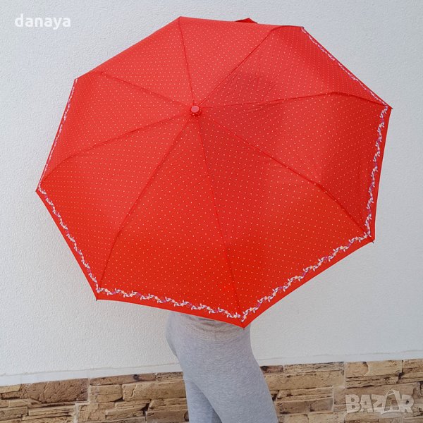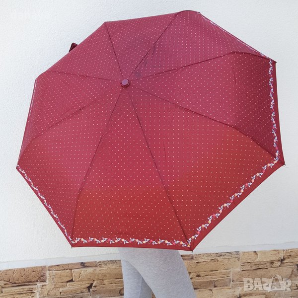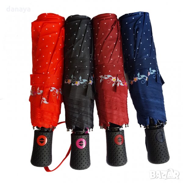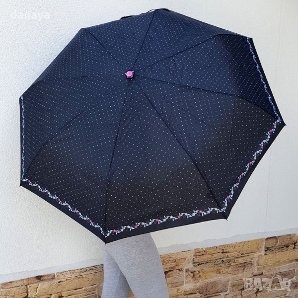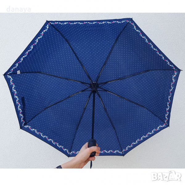 Двойно сгъваем автоматичен чадър за дъжд на точки и цветя по краищата. Чадър с метална основа, 8 метални спици. Автоматично отваряне и сгъване само с едно копче. Две степени на сгъване. Компактен размер в сгънато състояние - 28см. Може да се побере във всяка чанта.