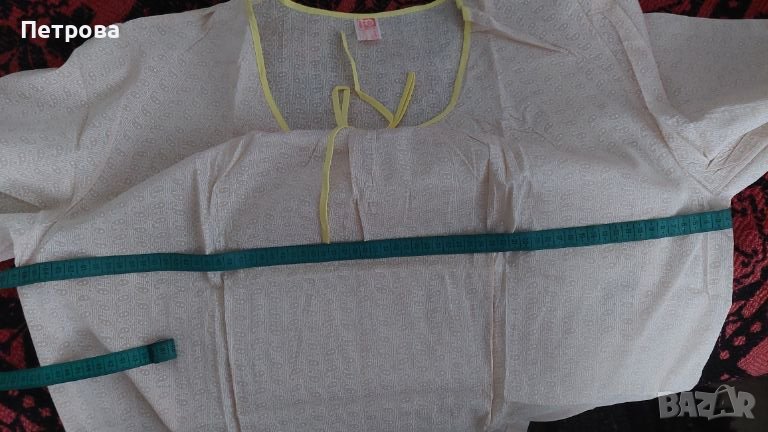 Продавам 4 нови памучни нощници, с къс ръкав, с голяма дължина. Приятна лека материя, бели със светлобежови дребни фигурки, обрамчени около деколтето, ръкавите и в долния край с жълт, син, зелен или оранжев кант - размери 158/96, 164/100, 170/112, 170/112. Дължина 115 см. Нощниците са доста големи и дълги, написаните размери са по етикет. Но на последните две, най-големите, например, измерено гръдната обиколка е 134 см. Най-малка е първата - в раменете 42 см, резедавата в раменете е 44 см, гр. обиколка и на двете 112 см. Цена за 1 бр. 10 евро. Подходящ подарък. Изпращат се с 10% намаление от общоприетата куриерска такса.