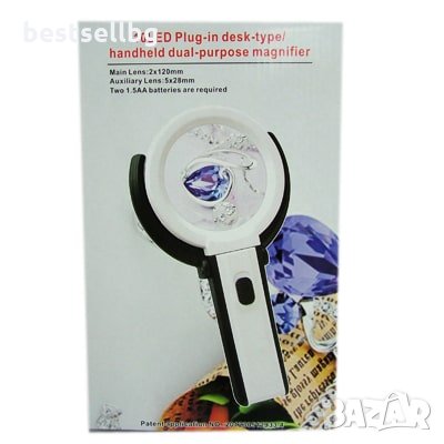 Универсална ръчна и настолна лупа, LED осветление, адаптер 2X и 5X увеличения за работа, четене, шиене на гоблени, бродиране, запояване, козметик, маникюр, часовникарска и други дейности, в които се изисква увеличение и осветление.