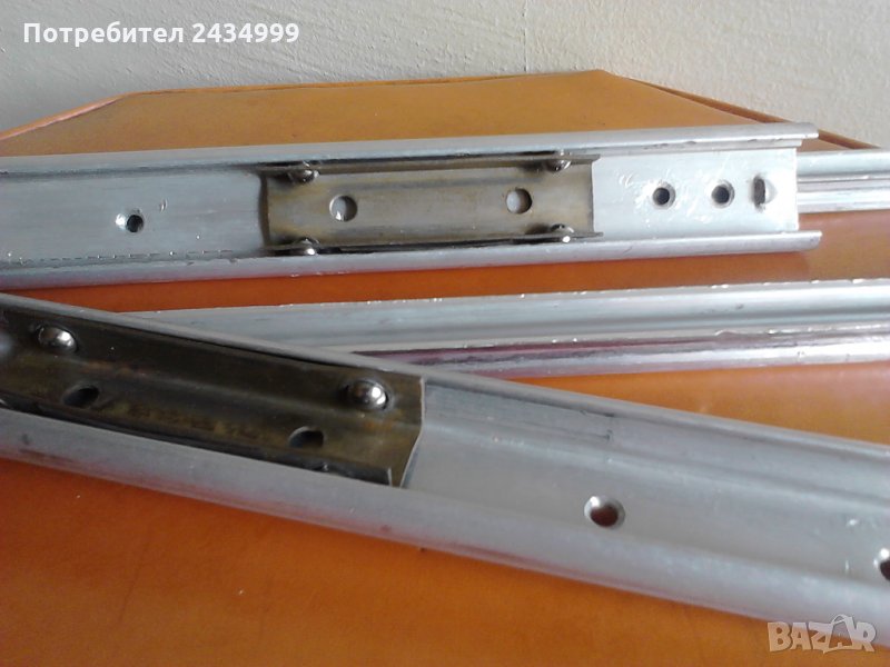 Продавам английски метални релси за чекмедже или плот. По-кьсата с дьлжина 25см и 7 дупки, която се завинтва за стената или дьската на сьответната мебел носи количката с 4 топчета, а другата релса с 5 дупки и дьлжина 33см, се завинтва за чекметатаджето или плота.