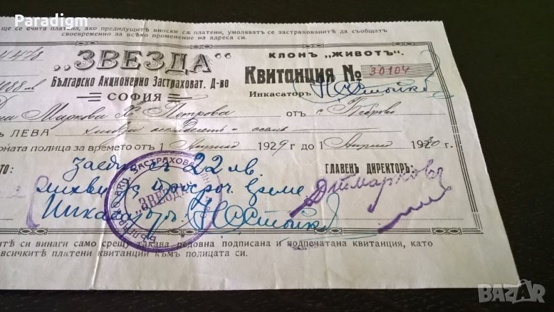 Върху квитанцията има 1 гербова марка на стойност 1 лв. от 1929г.