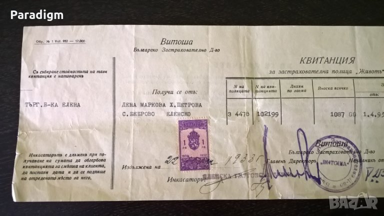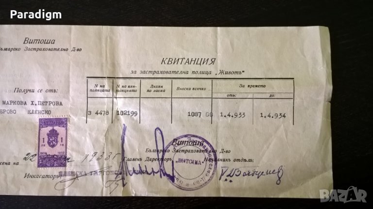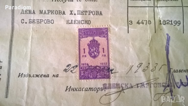 Върху квитанцията има 1 гербова марка на стойност 1 лв. от 1932г.