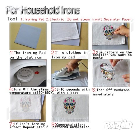 Поставете върху желана дреха -БЕЗ да премахвате защитно фолио , покрийте с парче плат,след което с топла ютия 120-150 градуса за 10-15 секунди минете отгоре ,след което отлепете защитното фолио.