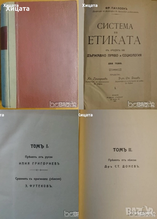 Библия, сиреч Книгите на Свещеното писание на Вехтия и Новия завет, 2011г. 1524стр. - 80лв; Библия, сиреч Книгите на Свещеното писание на Вехтия и Новия завет, 1995г. 1524стр. - 70лв; Библия или Свещеното Писание на Стария и Новия Завет. Вярно и точно преведена от оригинала. Издава Британското и чуждестранно библейско дружество, Придворна печатница, 1924г.,1222стр./958стр. +264стр./ Здрава, забележки по корицата. - 250лв. Служебник, Печатница бял кръст - Курилски манастир, София, 1928г.546стр. Изключително запазен! - 380лв. Кратка илюстрована библия. Ветхи и нови завет, Св. Синод на Българската църква, 1949г.436стр. -120лв. Священны пѣсни съ напѣвы / Свещени песни с напеви,327стр.,липсва началната страница с годината на отпечатване,но е ясно че около 1893г. - 700лв. Новый заветъ гда нашего iйса хрта, Нъю Ioркъ,1881г. 607стр.Американско Библейско Общество - 350лв Система на етиката съ очеркъ на държавното право и социология въ два тома.Томъ 1-2,Фридрих Паулсен,Глобусъ,1912г.782стр.Изключително състояние! - 100лв Училищен алманах.Година 1.1900г.Съставител и издател Христо Максимов,София-Пловдив Печатница Труд 1900г.906стр./810стр+96стр Обявления на Училищен Алманах/ Формат 190/130 Следи от влага на няколко страници. Първо и Единствено Издание! - 1350лв През 1899 г. се премества от Пловдив в София. Тук той замисля издаването на ежегоден училищен алманах. След няколкомесечна енергична работа със сътрудничеството на видни педагози през 1900 г. е издадена първата книга на алманаха – том с голям обем, красиво подвързан. Тя съдържа огромно количество материали и сведения за съвременното образователно дело и важни сведения и документи из историята на българското училище от самото Възраждане. Целият печат отбелязва книгата с радост. По това време Алманахът е единственият и незаменим справочник за всеки учител и за всички, които се интересуват от училищните дела. Този том се превръща в най-скъпата съкровищница на славното и светло зараждане на родното образование.Макар и направил големи дългове заради алманаха, които не може да изплати, Максимов подготвя втория брой, но не го издава.Умира на 13 април 1902 г. в София.
