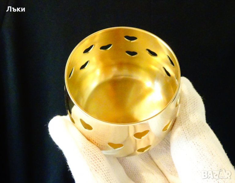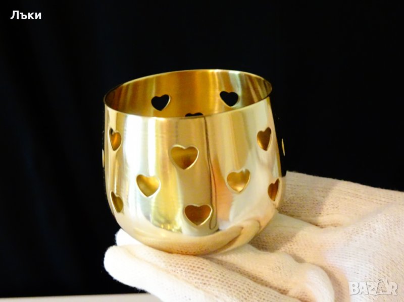 месинг,декориран с ажурни сърца.Височина 5 см.,диаметър 6 см.,тегло 70 гр.