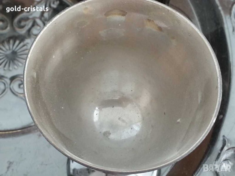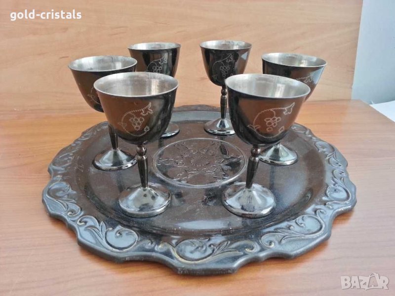 стари метални чаши вътре посребрени отвън емайл 6бр чаши и поднос месинг бронз и емайл с звън като камбанка посребрени отвътре ръчно гравирани сервизкомплект сет лот ретро арт декор винтидж колекция стари старинни антикварни предмети обзавеждане за дома и семейството подходящи за подарък за ценители и колекционери