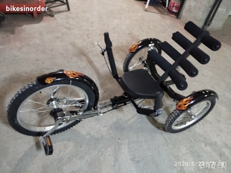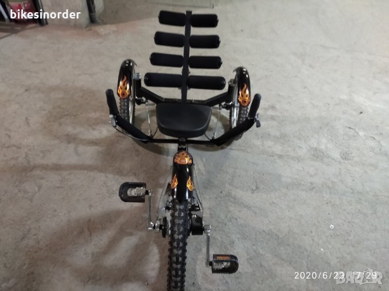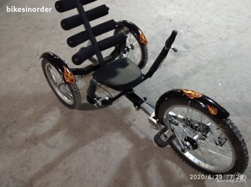 Чисто нова вело-триколка, с 1г. гаранция. Къстъм мейд разбира се. Позволява дрифт при по висока скорост. Карал съм всякакви колела, които можете и не можете да си представите, но не съм се забавлявал така както с това колело. Човек се чувства удобно облегнат и релаксиран, така че умората е минимална. Най важното, е че позволява на хора с проблеми в гръбначния стълб или с равновесието да спортуват любимия си спорт. Тъй като дължината и наклона на облегалката се регулират, може да се кара от хора между 1,60 и 1,90. Не се изпраща по куриери,