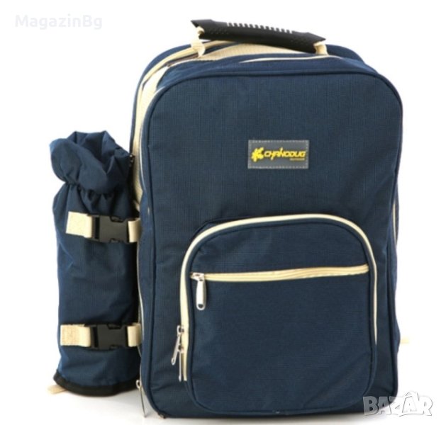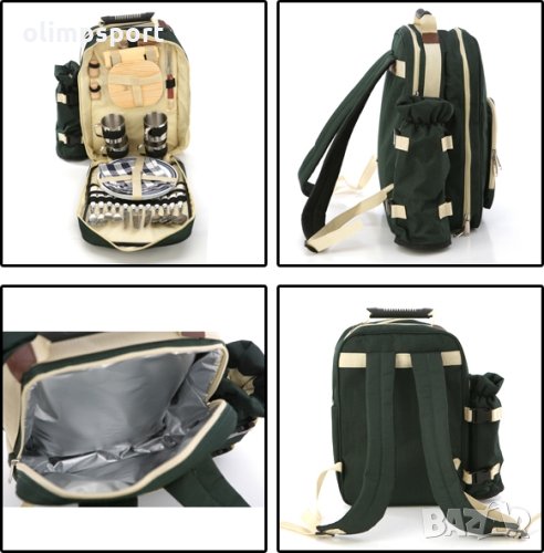 Раница за пикник с всички необходими съдове и прибори за четирима. Раницата има 2 основни отделения – едното е термо камера за храна, а в другото прилежно са подредени съдовете и приборите. Към раницата е прикрепена и чантичка за бутилка, която може да се носи самостоятелно. Комплектът съдържа: 4 памучни салфетки за сервиране, 4 чинии Ф22.5см, 4 метални чаши, 4 вилици, 4 лъжици, 4 ножа, дъска за рязане, универсален нож за рязане, сгъваемо ножче с тирбушон и отварачка за бутилки, 2 солнички, текстилна торбичка за мръсните съдове и прибори. Всички части са фиксирани с велкро лепенки, за да не се разпиляват при пренасяне. Раницата за пикник е удобна и практична и би могла бъде страхотен подарък за хора, които държат да се хранят изискано и сред природата