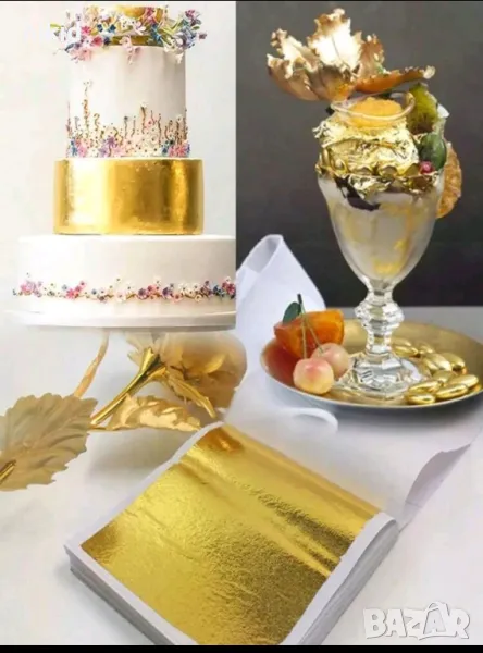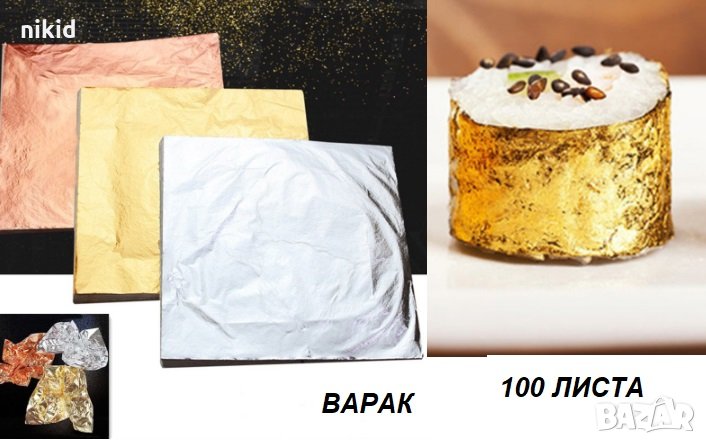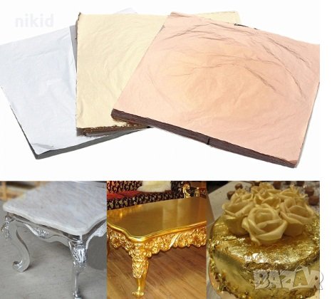 Изключително фин лист варак.Предназначен за позлатяване и посребряване декориране на всякакви предмети Подходящ за използване върху повърхности като дърво, мрамор, гранит , сладкарство , декупаж всякакви елементи