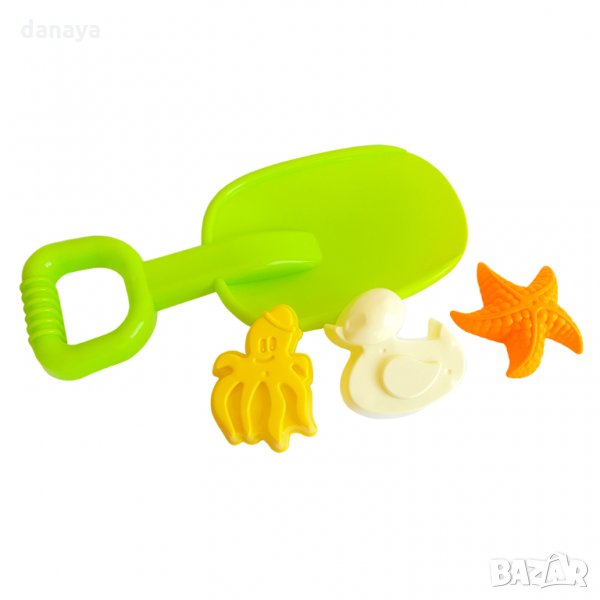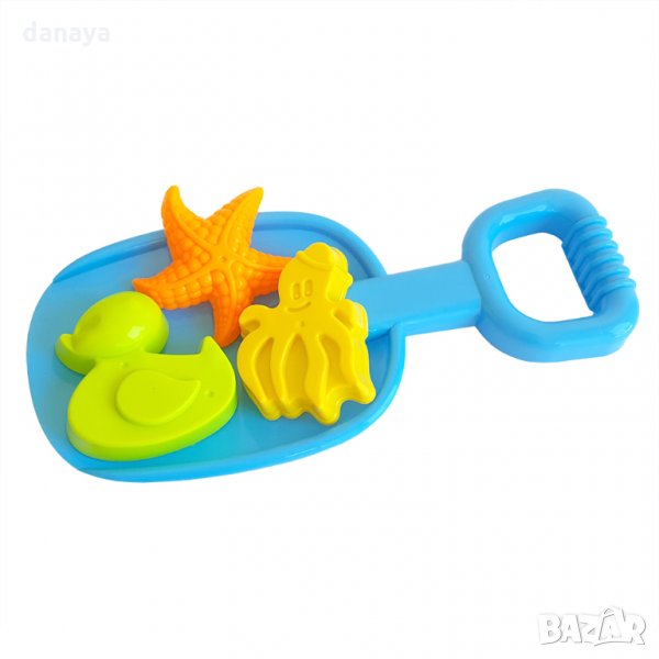 Комплект плажни играчки за пясък, който включва голяма лопатка за пясък и три различни формички за пясък - пате, морска звезда и октопод. Свежи ярки цветове.