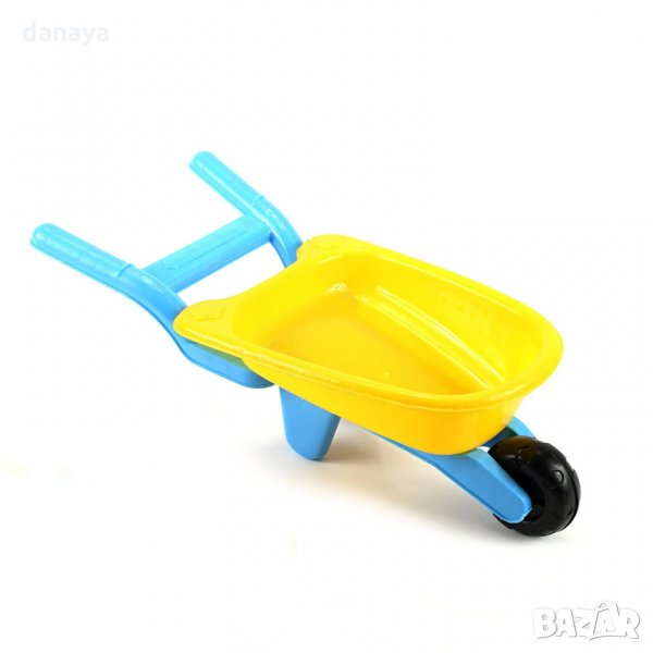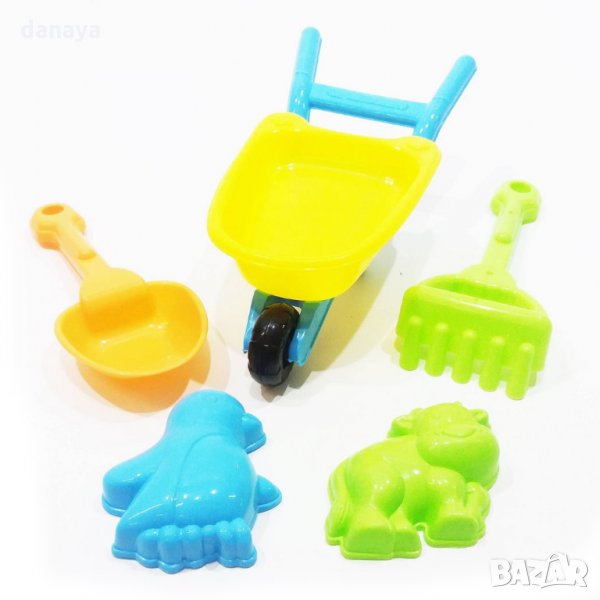 Игрален комплект за пясък, който включва количка за пясък, лопатка, търмък и 2 броя формички за пясък. Чудесно забавление на плажа или пясъчника. Свежи ярки цветове!