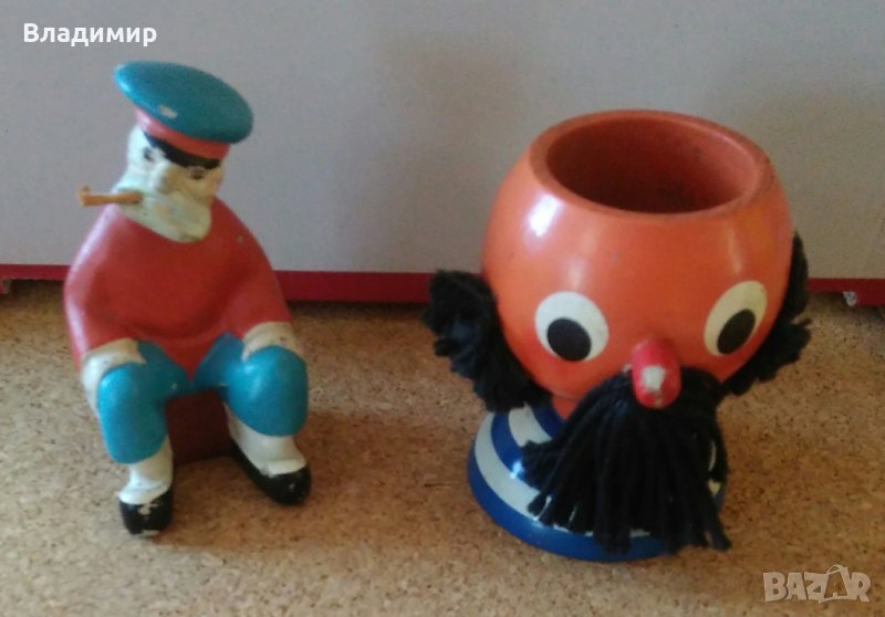 Продавам ретро моряшки сувенири в добре запазено състояние, видно от снимките:1. Моряк-чашка, дървена, височина на сувенира 9 см., диаметър чаша 5 см., височина - 6 см., дълбочина 4.5 см., обиколка 20 см. - цена 12 лева и 2.Статуетка "Старият моряк", височина 10 см., ширина в основата 5 см./5 см. - цена 20 лева