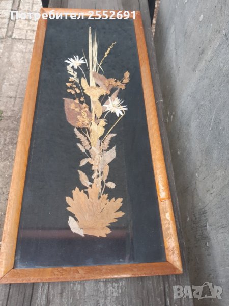 Пано от сушени цветя ,стъкло, дървена рамка. Производство фирма "Изгрев"-Белово. Размери 17/41 см.