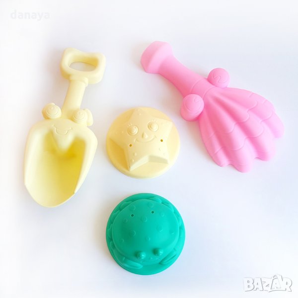 Комплект играчки за пясък, който включва мелница за пясък, две лопатки с различна форма и 2 броя формички за пясък. Чудесно забавление за децата, когато сте на плажа или пясъчника.