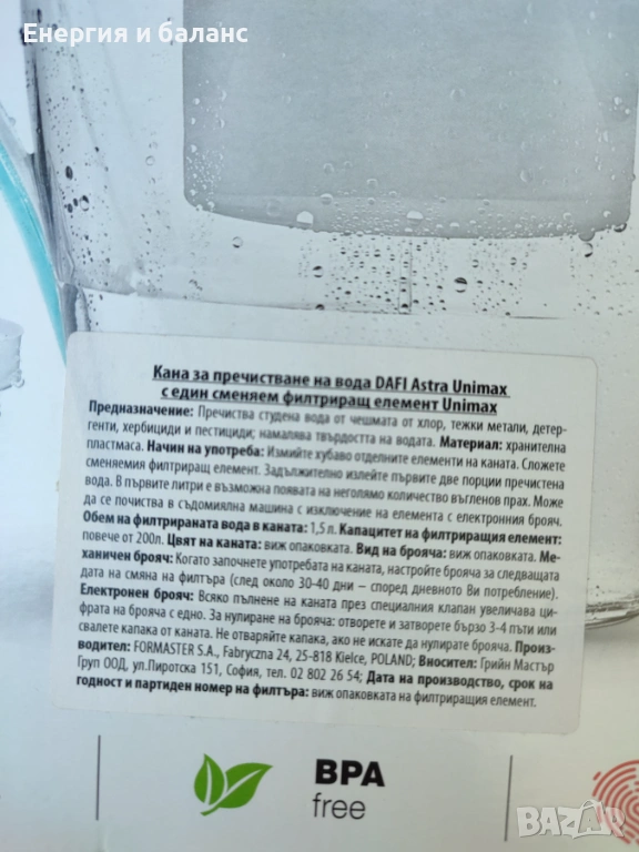 Обем на филтрираната вода: 1.5 л.