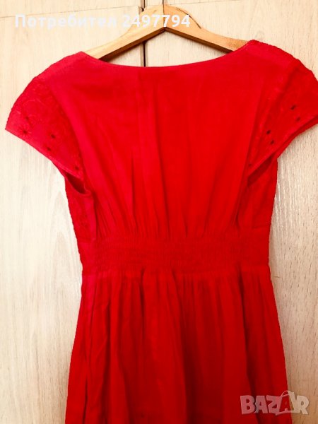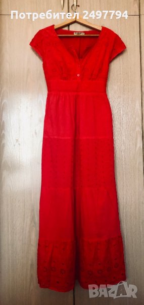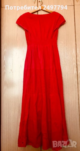 Красива червена рокля за лятото, с набор с ластик в задната част. Наборът е под гърдите. Памук 100%, с различни дантели на волани. Дължина -133 см, ширина в набора - 69 см, като ластичната част предполага разширяване.