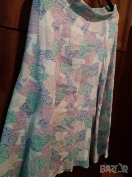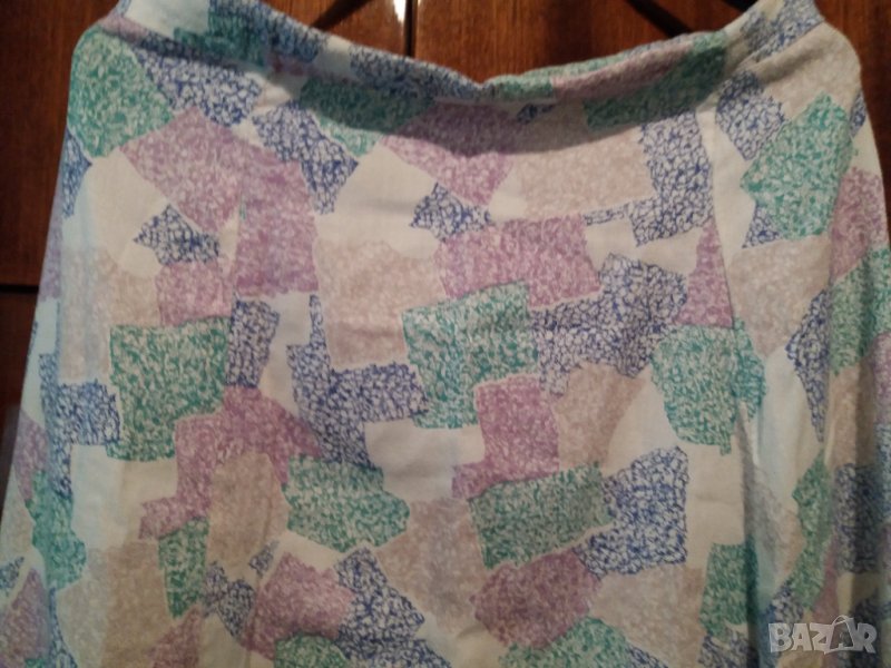 Дамска лятна пола, разкроена /3 парчета отпред и 3 парчета отзад, тънка мека материя, цвят комбинация от бяло, розово, синьо, зелено, жълто, без цип. Размер М, талия 40 см, ханш разширява се от 56 см /112 см, дължина 68 см. Отговарям на съобщения тук, изпращам с куриер с отстъпка, преглед и тест, или лично предаване в София.