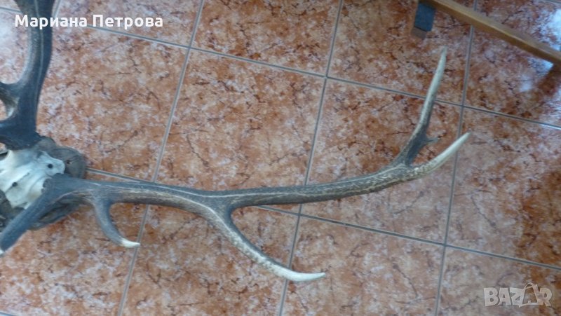 В много добро състояние, напълно съръзмерим и подходящ за украса в механа, битова стая, барбекю или подарък. Има 6 разклонения, напълно съразмерими и част от черепа върху красива подложка. Дължината на всеки рог е 60 см.