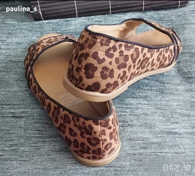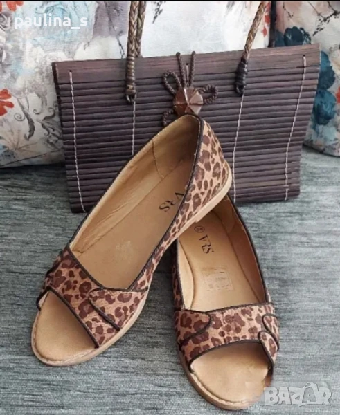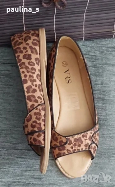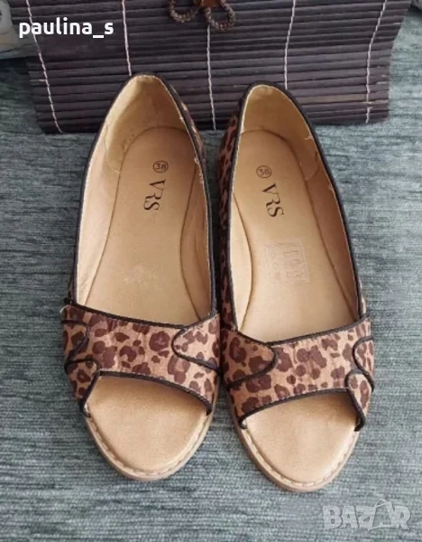 2️⃣. "VRS" / N 38. Цената е крайна 29,99лв / 15 евро. Отворени бувки тип сандали в леопардов принт, от артифициална кожа и текстил. Сладурски обувки тип сандали с отворен форт. Изработката е на ниво, материята на лицевата част е сатениран плат, окантени. Не са чисто нови, състояние видимо от снимките, без дефекти! Като нови! Подметка 25см / Стелка 24,5см
