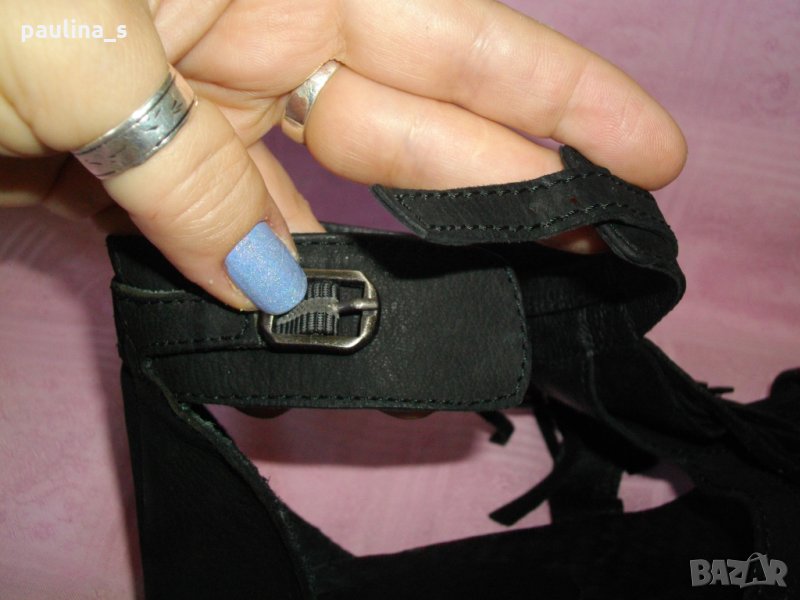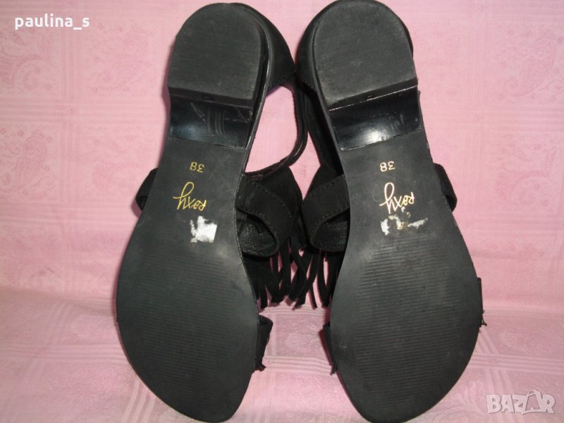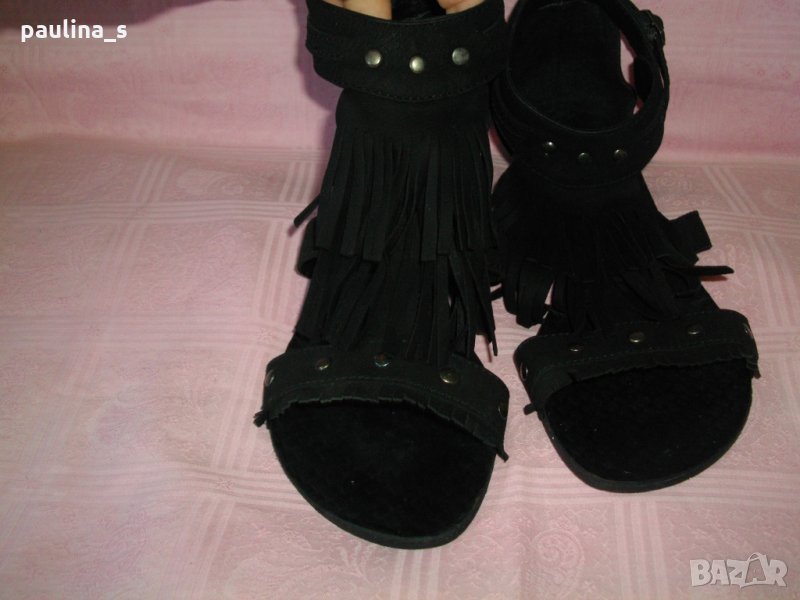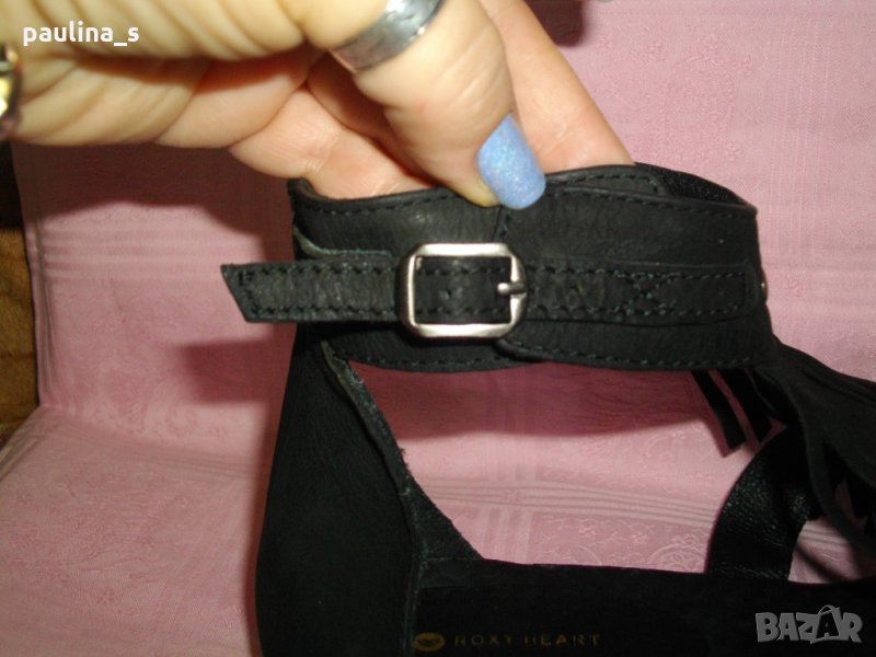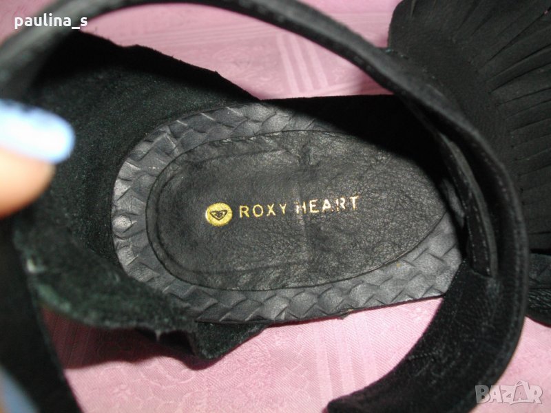 1️⃣ . "Roxy heart". Цената е крайна 34,99лв / 17,5 евро. Сандали от естествен набук с декорации от ресни и кабси. Закопчалката е еластична, не са носени, само пробвани. Изумителни. Стелка 25,5см.