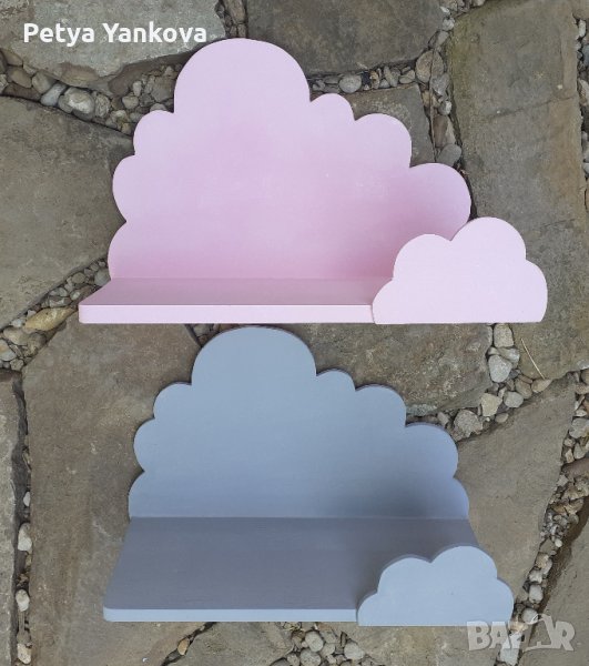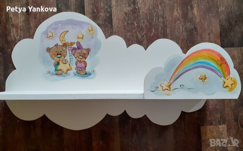 дървена рисувана етажерка с форма на облак, може да се боядиса в цвят по желание , както и да се направи с рисунки по желание. Срок за изработка около 10 дни