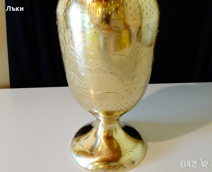 масивен златен бронз.Релефно гравирана с разкошни флорални мотиви и орнаменти.Едновременно изящно изваяна и внушителна.Височина 30 см.,диаметър 14 см.,тегло