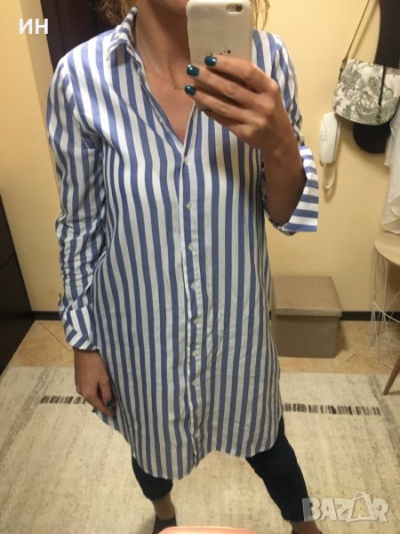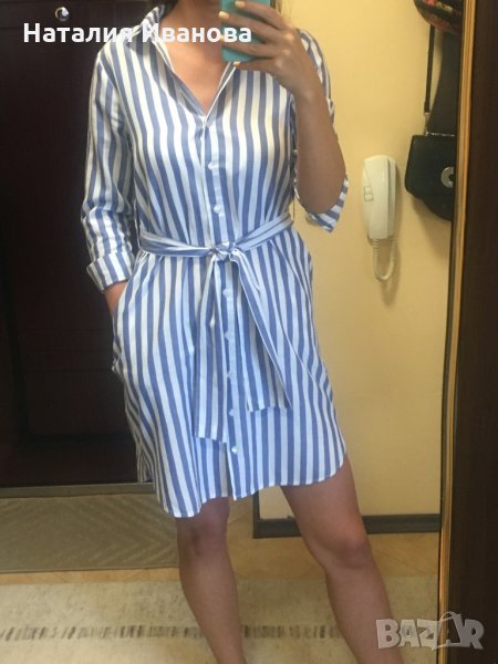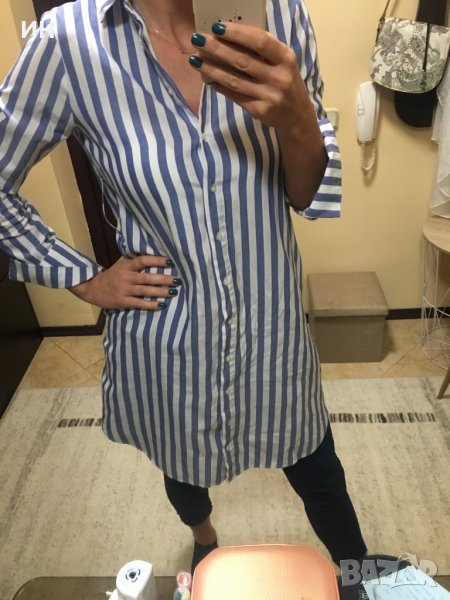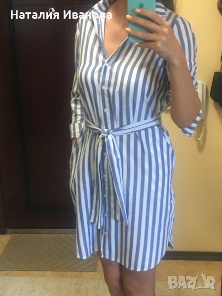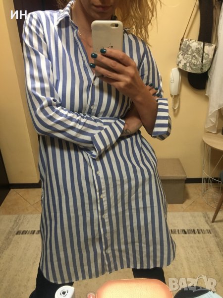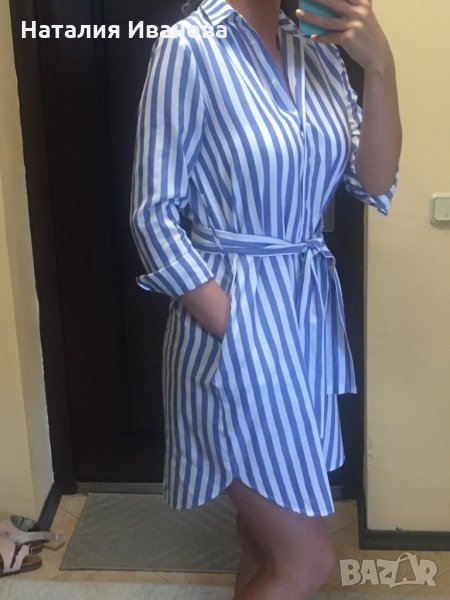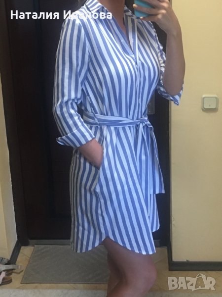Продавам риза- рокля в бяло и светло синьо райе, с джобове , колан на талията , който може да се маха, непрозрачна, с дълги ръкави. Не се разменя за друга стока.