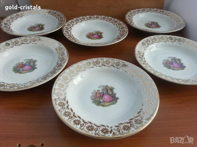 Сервиз български порцеланови чинии с позлата златен кант неизползвани маркирани 6бр-120лв дълбоки комплект сет лот ретро арт декор винтидж колекция стари антикварни предмети обзавеждане за дома и семейството подходящи за подарък за ценители и колекционери