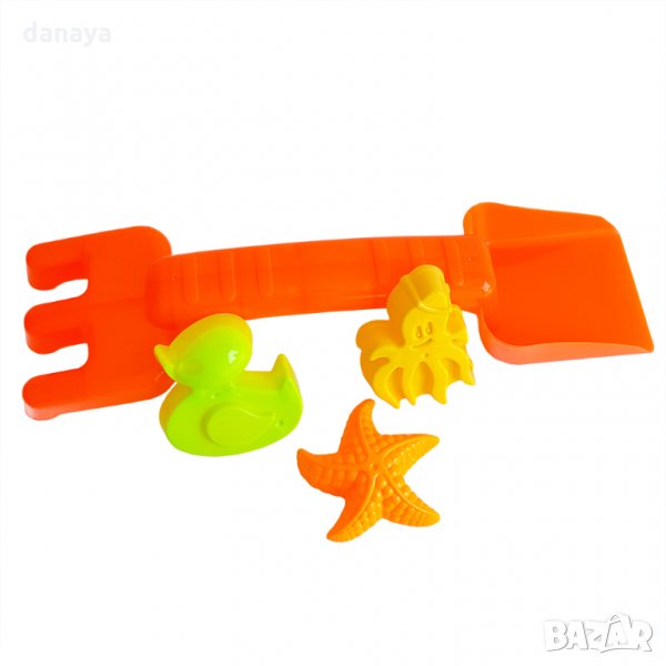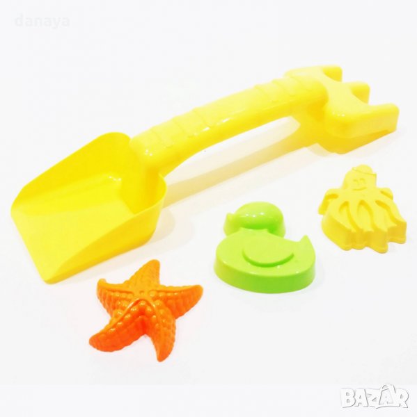2 в 1 голяма играчка за пясък - от едната страна е лопатка за пясък, от другата търмък. В комплекта са включени 3 броя различни формички за пясък - октопод пате и морска звезда. Чудесно забавление за децата, когато са наплажа или на пясъчника. Изработени от пластмаса.