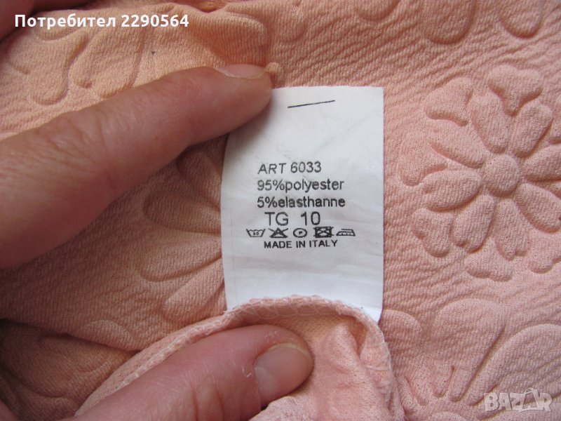 Подарък за дъщеря ми от роднини. Платът е розова плътна подобна на травира материя, щампирана с релефни цветя. Еластична и немачкаема, като за всеки ден. Горната част е с редингот, а отпред има цип.