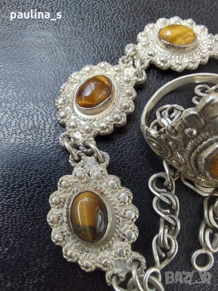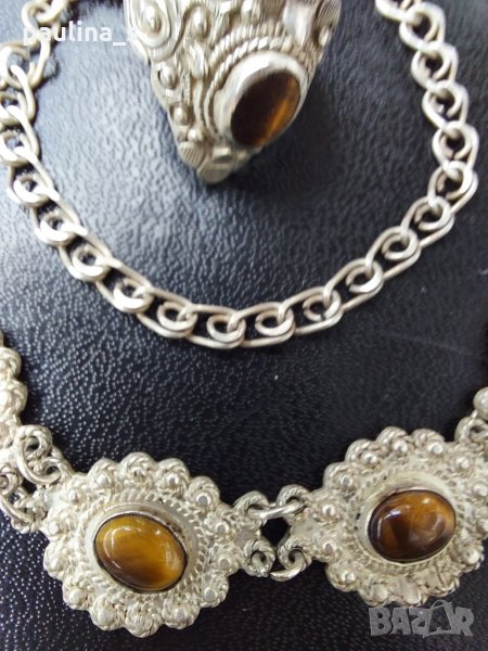 1️⃣. Винтидж / Стар семеен сребърен комплект с Тигрово око. Цената е крайна, без пазарлъци 309,99лв / 155 евро. Има антична стойност и цена, от Турция. Изработката е филигран, много красив и впечатляващ. За ценителки на изящната бижутерия. Подходящ за подарък или повод. Не се продава на грамаж, достатъчно масивна и достолепна бижутерия, заслужаваща цената си.
