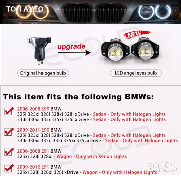 Придайте уникална и съвременна визия на вашето БМВ. По-ярки от обикновените ангелски очи, лесно забележими в комбинация с ксенонови светлини, което дава възможност да се ползват като дневни светлини.Бърз и лесен монтаж- монтирате директно на мястото на фабричните жълти халогенни крушки без никакво препрявяне, а капаците се затварят. Този модел има вграден Canbus модул и за това НЕ дава грешки на бордови компютър. За BMW