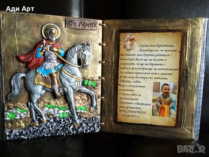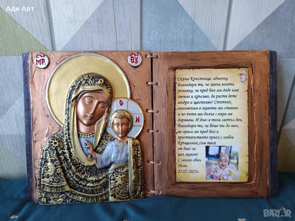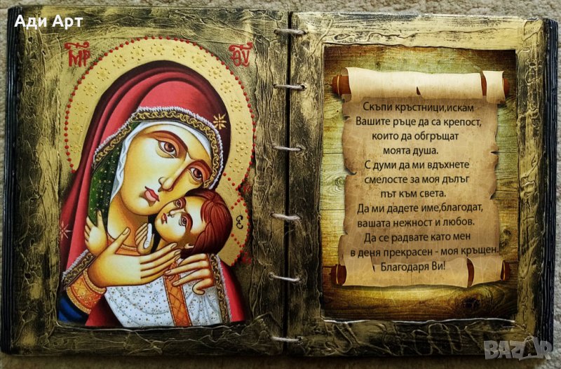 икона с пожелание със или без снимка на кръщелника,оригинален подарък за кръстник/кръстници,може да си изберете светец или текст по ваше желание.цени от 25 до 50Е
