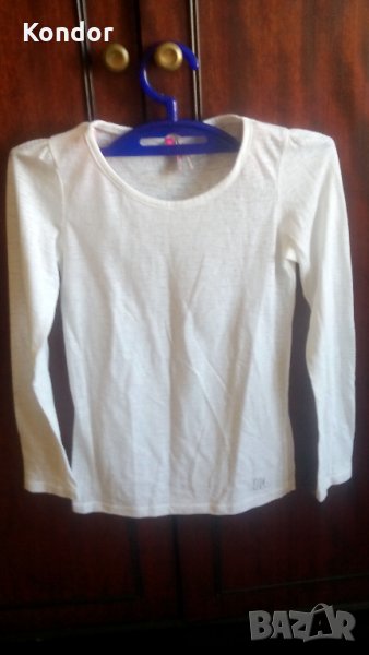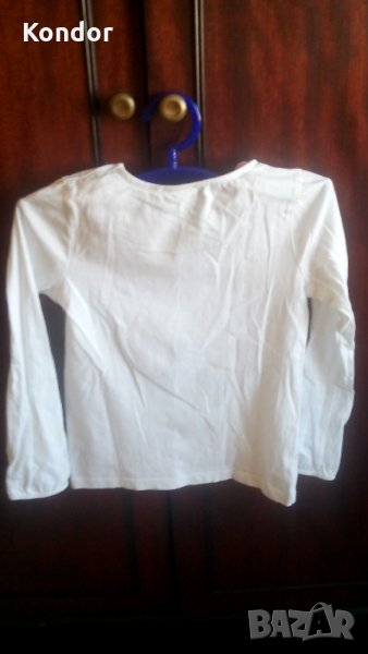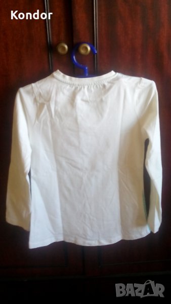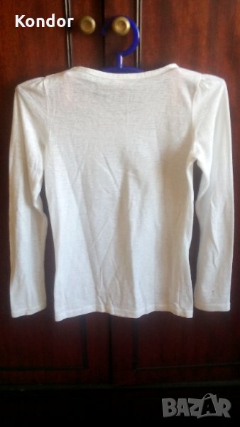 Блузка детска за момиче JOVELY ORCHESTRA Размер 128 см. За 8 годишни. Състав 100% памук. Цвят бяла. С обло деколте с дълбочина 6 см. Обща дължина 49 см. Дължина дълъг ръкав 46 см. Ширина ръкав горе 24 см, долу 16 см. Широчина рамене 24 +24 см, широчина гърди 30 + 30 см, широчина талия 58 см, ханш 60см