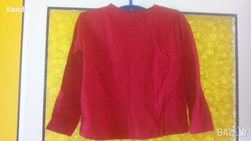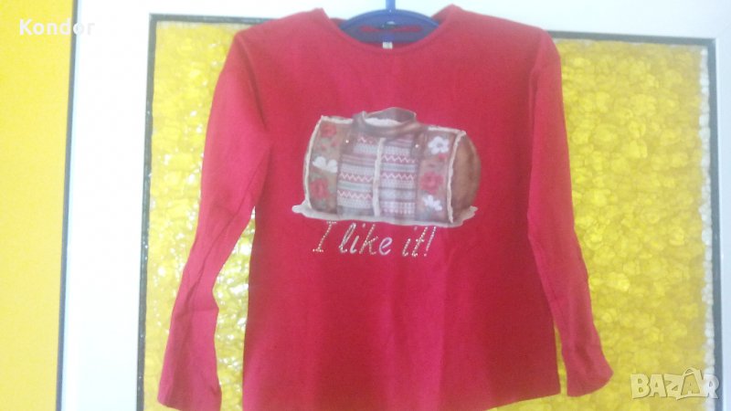 Блузка детска за момиче mayoral geans Размер 122 см. За 7 годишни. Състав 100% памук. Цвят тъмночервен. Апликация отпред и надпис I like it! С обло деколте с дълбочина 4 см. Обща дължина 43 см. Дължина дълъг ръкав 34 см. Ширина ръкав