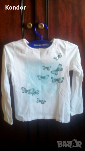 128 см. За 8 годишни. Състав 100% памук. Цвят бяла. Апликация отпред 8 сини с паейти пеперуди и 5 бели пеперуди на безоблачно синьо небе. С обло деколте с дълбочина