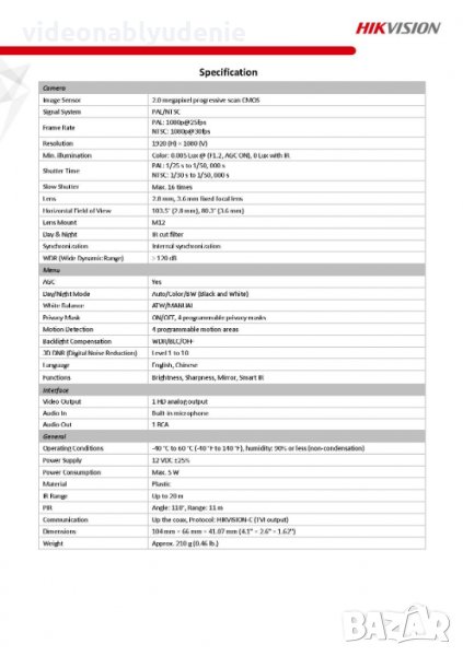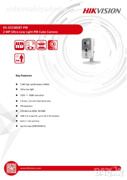 2МРХ Ultra-Low Light алармена IR камера с фиксиран 2.8мм обектив. Разполага с ъгъл на видимост 103.5° както и интелигентно IR осветление с обхват до 20 метра в нощен режим. Вграден PIR сензор за движение (110°/11 м) за по-прецизна детекция.