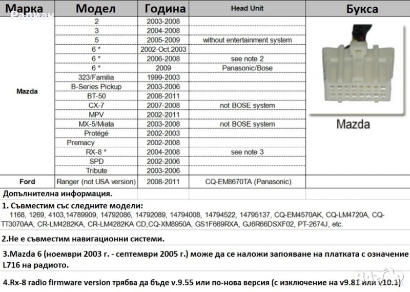MAZDA - 2004 - 2008 Mazda 3, 2006 - 2009 Mazda 5 ( without entertainment system ), 2002 - 2003 Mazda 6, 2006 - 2008 Mazda 6 ( see note 2 ), 2009 Mazda 6 ( Panasonic / Bose ), 2003 - 2008 Miata / MX5 ( non Bose ), 2002 - 2006 SPD, 2007-2008 CX7 ( non Bose ), 2004 - 2008 RX8 ( see note 3 ), 2002 - 2006 Tribute, 2002 - 2008 Premacy, 1999 - 2003 Mazda 323, 2002 - 2011 MPV, 2003 - 2006 B-series Pickup, 2008 - 2011 BT - 50
