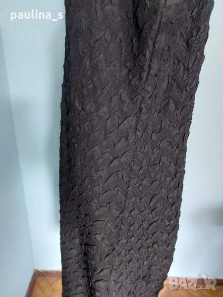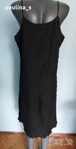 "Малка черна рокля" шита по поръчка за повод. Обличана е веднъж. Моделът е семпъл с леко разкрение в долната част. Материята е еластична копринена тафта, фабрично оформена на релефни цветя със сатениращ отблясък, което е ефектът на дрехата.