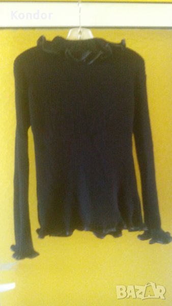 14 US 10 EUR 42. Цвят черен. Състав 80% вълна, 20% акрил. Акрила позволява материята да „поеме” тялото и да застане по неговия размер. Превъзходна дамска кройка, подчертаваща женските прелести . Деколтето е дискретно само 7 см, остро. С разкошно жабо с 10 черни украсителни копченца, обкатено със сатенена ива, обхващащо цялото деколте; същите рюшове са и на ръкавите и в края на цялата блуза.
