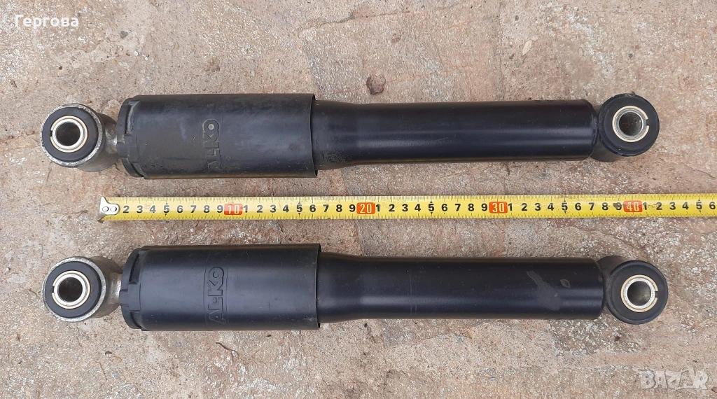 Почти нови задни амортисьори AL-KO за леко шаси. Диаметър на отвора на ухото - 16мм, дължина отворен 385мм, дължина затворен 320мм (център-център)- 80лв за двата