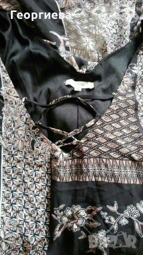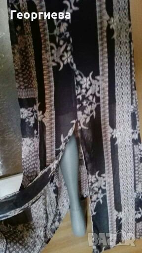 Красива цветна рокля с прозрачна лицева част и подплата от горната част до около коляното.В задната част има цепка.Около талията е на ластик.Роклята е чисто нова, без хартиен етикет.Перфектна е и за повод!